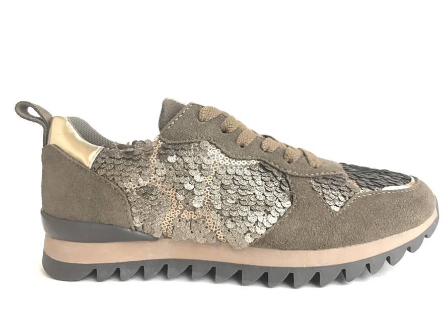 Кроссовки модного, в этом сезоне, цвета хаки выполнены из натуральной замши, боковая часть и носок декорированы блестящей россыпью. Эта модель легко сочетается с любым стилем одежды и добавит изюминку в ваш повседневный образ. Благодаря оригинальной зубчатой подошве кроссовки обеспечат комфорт и правильное распределение нагрузки на стопу. Обувь размер в размер.