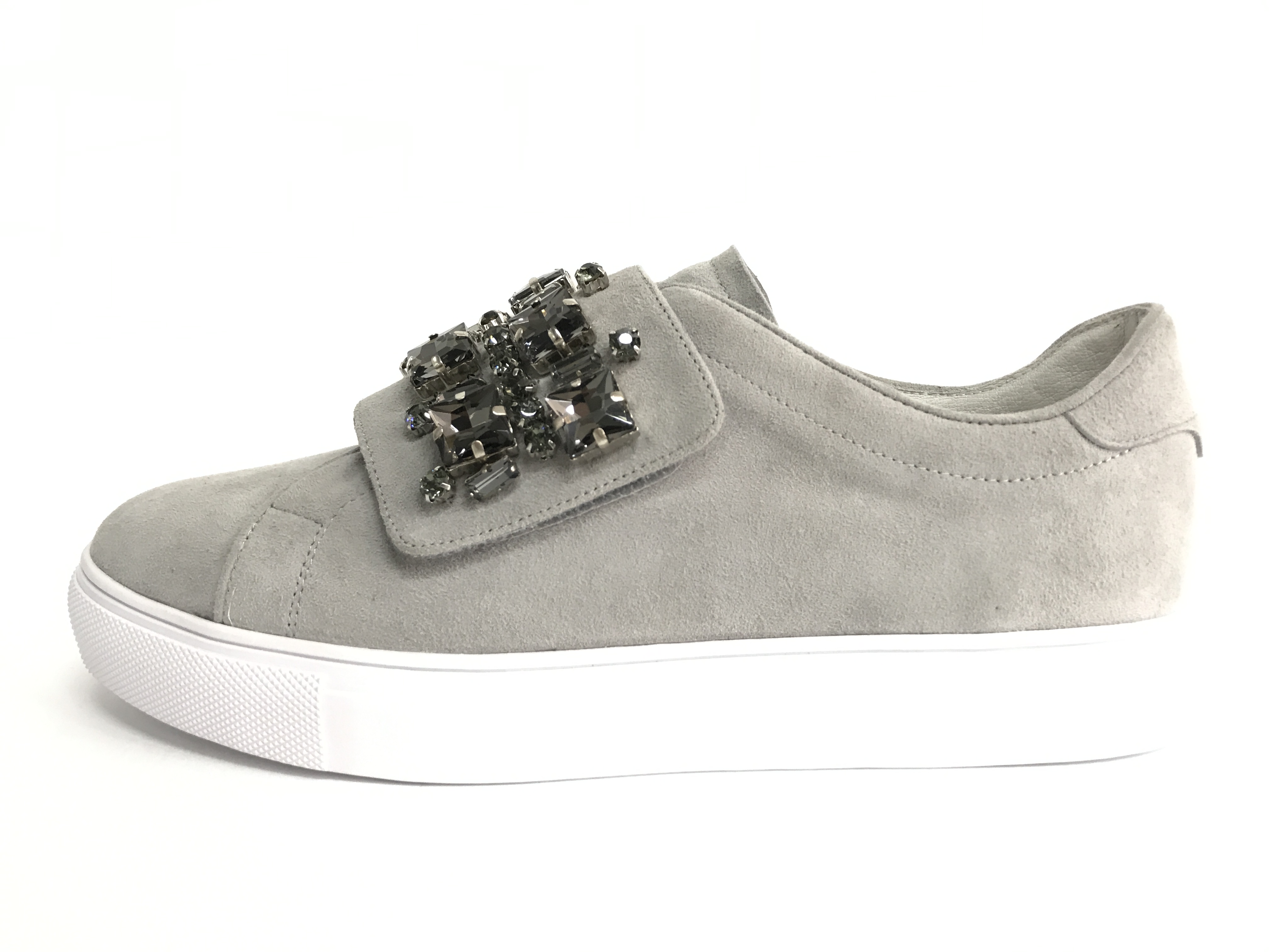 Слипоны из серо-бежевой замши станут прекрасным дополнение любого вашего образа. Широкая застежка на липучке украшена прямоугольными темно-серыми камням. Ровная подошва из белой резины. Обувь размер в размер.